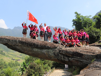 1 . 现场教学:龙胜白面瑶寨-红军岩 参观巨石下刻写的“红军绝对保护瑶民”标语,听红军与少数民族同胞团结互助、水乳交融的一段往事。