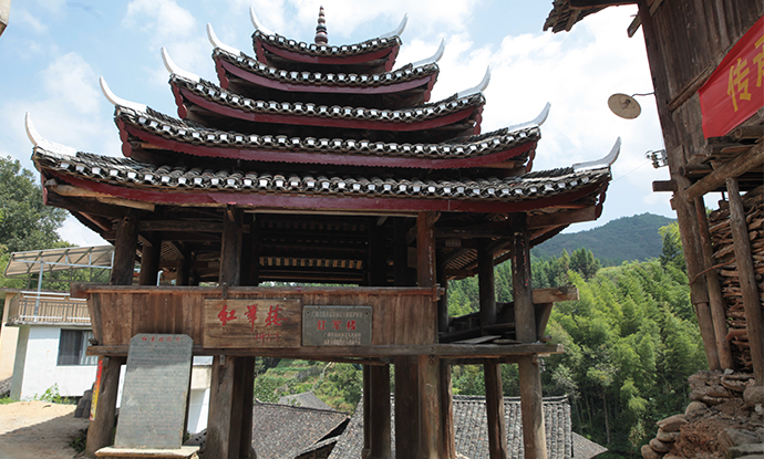 该楼建筑面积100平方米,进深10米、楼高10米,有五层瓦檐。一楼为过街巷,二楼为群众集会议事和娱乐场所,是典型的桂北侗族过街鼓楼。