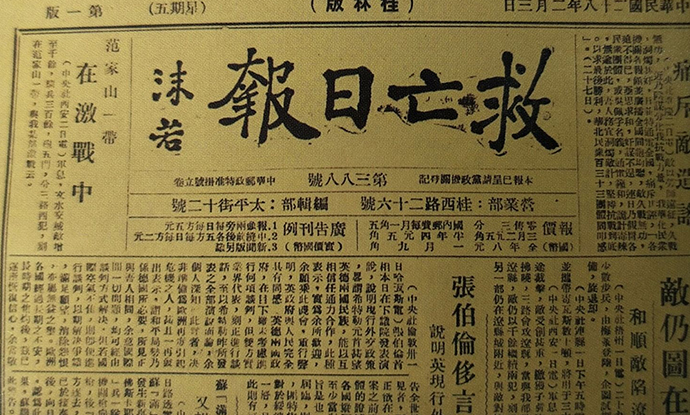 《救亡日报》是抗战时期中国共产党在国统区上海直接领导创办的一份外围进步报纸。几经辗转于1939年1月在桂林复刊,成为当时抗战大后方的重要舆论阵地之一。郭沫若任社长,夏衍任主编并撰写了大部分社论和时评。