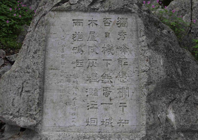 在独秀峰山下,还留存有抗战时期的石刻,如:广为人知的摩崖石刻“卓然独立天地间”,此石刻是民国时期一名铁血大律师吴迈所题。通过对独秀峰形状的描摹,赞誉桂林不畏侵略者的抗战硬骨头精神。以及日本侵略军轰炸桂林后,诗刻于独秀峰北麓崖壁上画家赖少其《忆桂林大火》一诗 :“独秀峰前凭栏杆,知否日机下铁蛋? 一城木屋成灰烬,漓江烟雨犹呜咽”。让世代铭记日本侵略军给桂林人民带来的深重灾难。