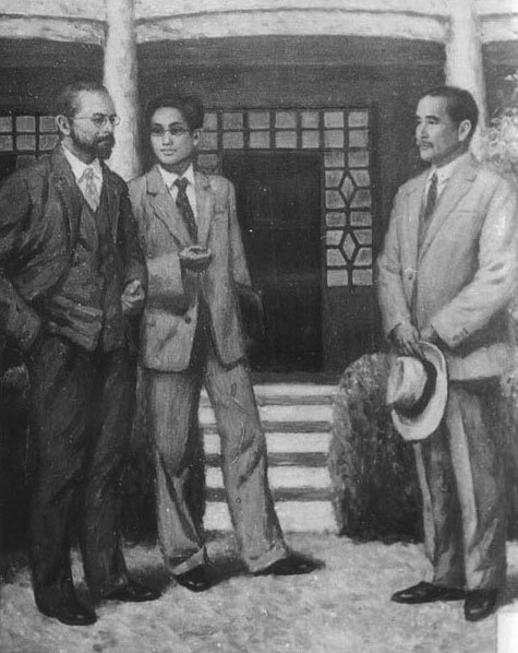 图为油画:依次顺序左一为马林,中间张太雷,右一孙中山