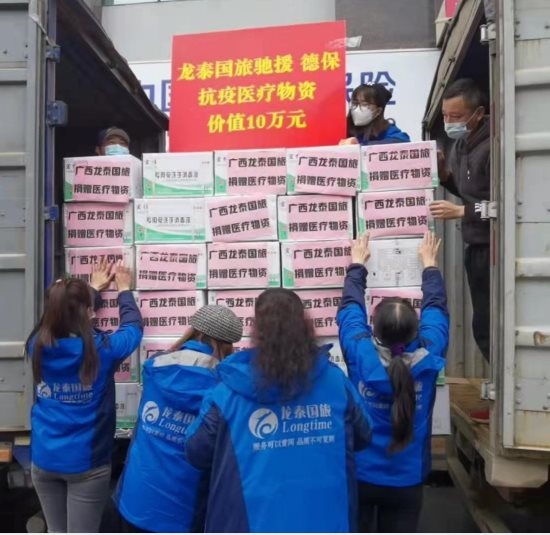 疫情爆发以来,广西龙州红文化旅游有限公司以及广西龙泰国际旅行社有限公司,传承弘扬社会正能量,依据相关抗疫捐献文件,分别向崇左龙州县和百色德保县捐赠医用外科口罩、专用免洗手消毒液、次氯酸钠消毒液、饮用水、方便面等累积价值13万元的防疫物资。虽然近两年旅游业受到前所未有的打击,但是作为有担当有责任的企业,为打赢疫情阻击战,为抗击疫情,贡献出一份力量,用爱心为抗击疫情助力,共同战“疫”,一起向未来!